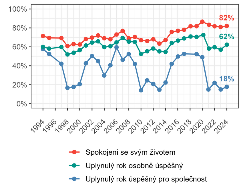 Graf: Srovnání vývoje spokojenosti s vlastním životem, hodnocení osobní úspěšnosti uplynulého roku a hodnocení úspěšnosti uplynulého roku pro společnost jako celek