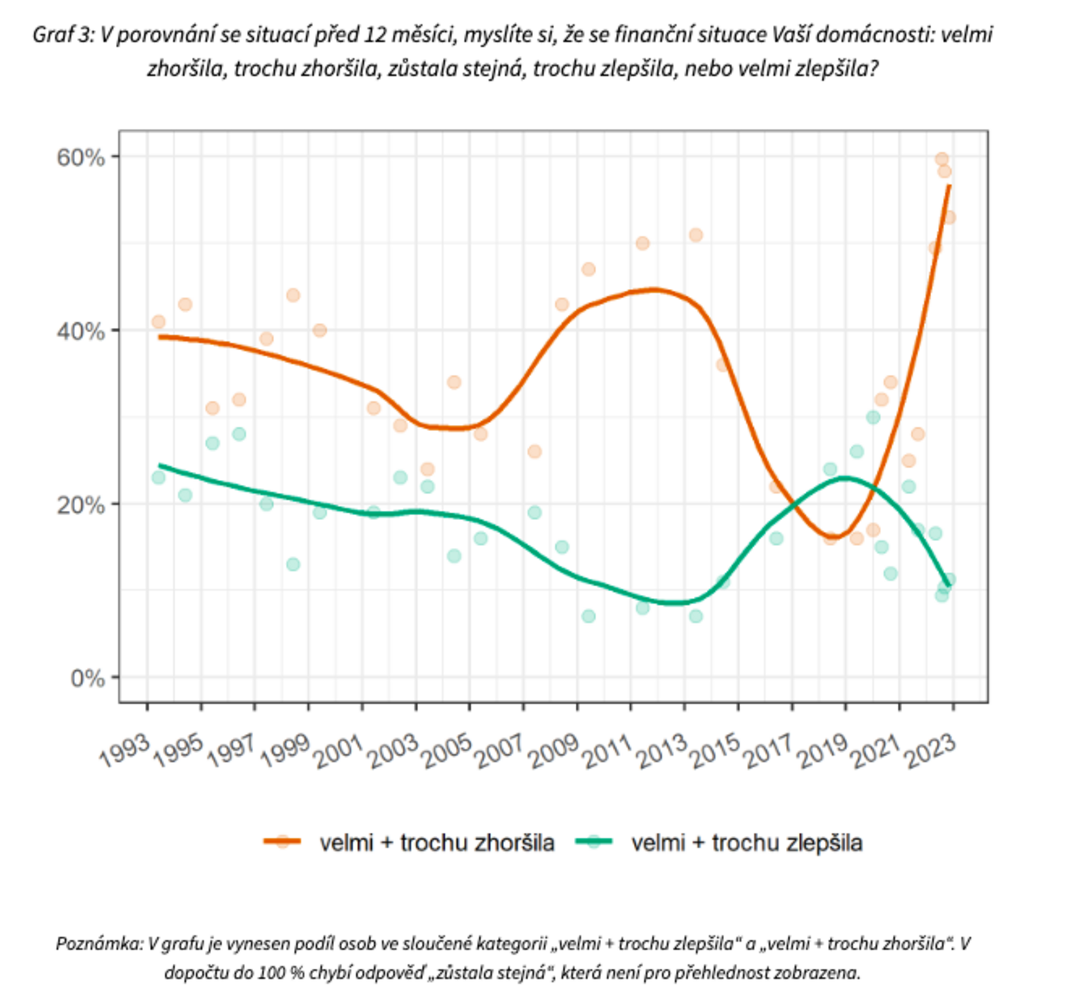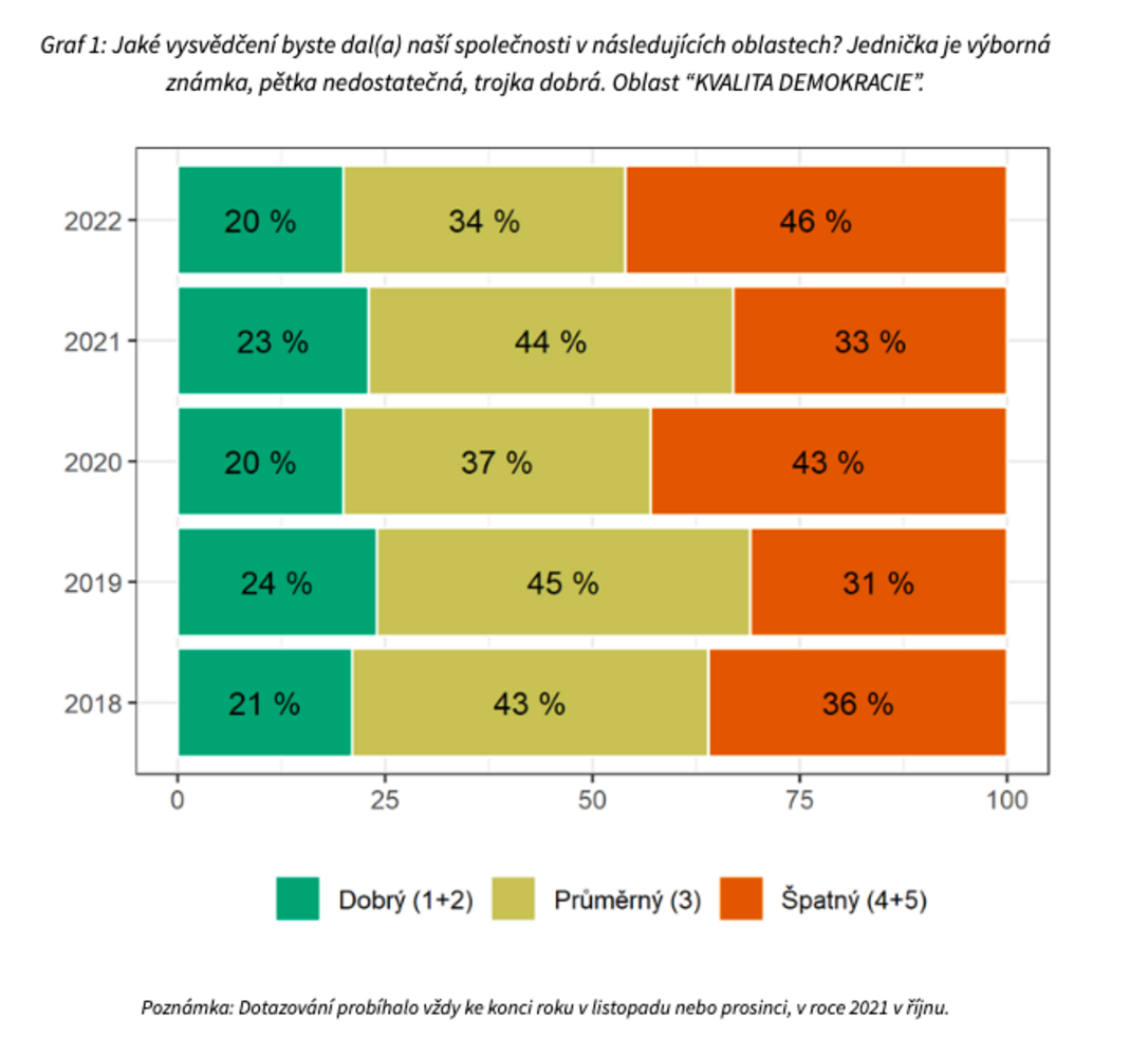 Za horším hodnocením kvality demokracie i jednotlivých držitelů moci může být i skutečnost, že česká společnost nezažívá dobré roky. Pandemie COVID-19 narušila život většině společnosti. Hned v závěsu dopadly na životy lidí důsledky války na Ukrajině spojené s nejistotou a mírou inflace, kterou česká společnost nezažila ani v období transformačních 90. let. V roce 2022 tak domácnostem poklesly reálné mzdy poprvé od kulminace dopadů globální ekonomické krize v roce 2013, a to navíc výrazněji. Zatímco valorizace důchodů vedly k zachování životní úrovně seniorů (pravděpodobně však nikoliv k jejímu navýšení), do finančně obtížné situace se dostávají nízkopříjmové rodiny, rodiny s dětmi a také lidé žijící v rodinných domech, kterým nejvíce rostly náklady na vytápění. Výsledkem je, že mezi 50 a 60 % lidí v roce 2022 vnímalo, že se finanční situace jejich domácnosti v porovnání se situací před rokem zhoršila. To je více než kdykoliv předtím a v ostrém kontrastu s roky 2018 a 2019, kdy takových lidí bylo méně než 20 %.