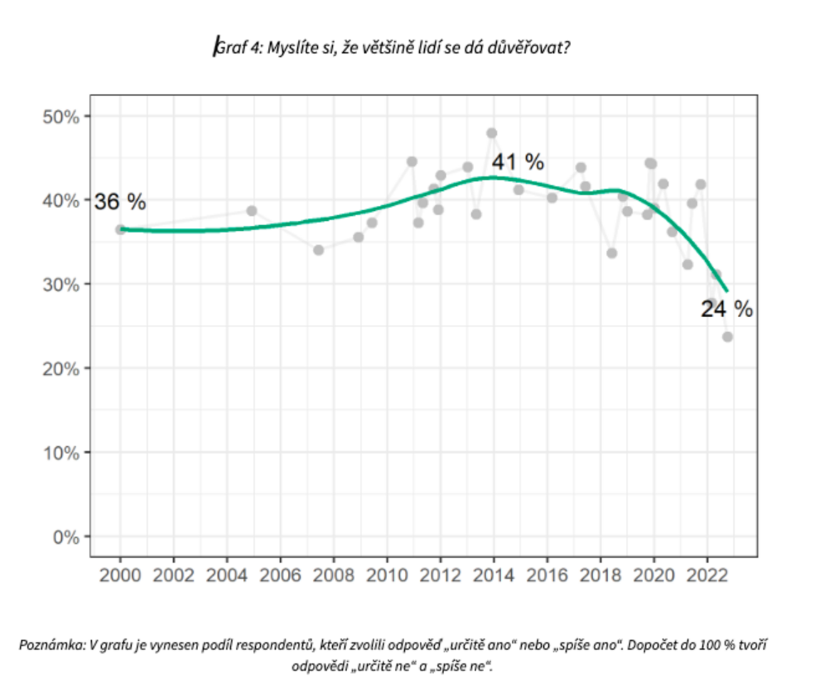 Experti ve zprávě dochází k tomu, že česká společnost se nachází ve fázi jedné z nejhlubších krizí důvěry v instituce i ostatní lidi ve společnosti od počátku existence České republiky. Zřejmě je to daň za tři roky plné zkoušek. Sebevědomí střední třídy je ale zatím stále na vysoké úrovni, trvá solidarita s ukrajinskými uprchlíky a společnost jako celek zůstává stabilní.