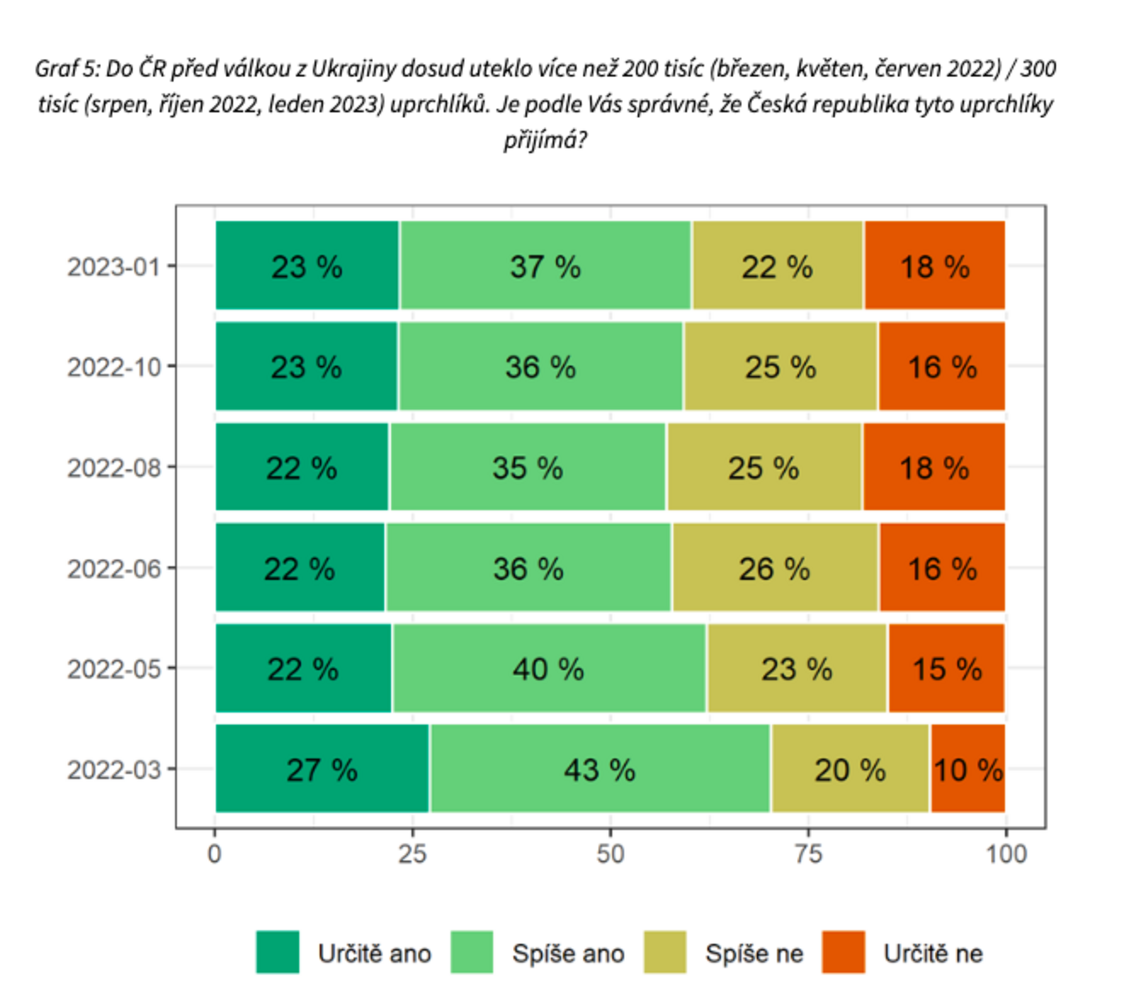 Pozitivní zprávou na pozadí spíše negativního celkového vývoje posledních let je skutečnost, že míra solidarity české veřejnosti s ukrajinskými uprchlíky zůstává poměrně vysoká. Na jaře minulého roku po vypuknutí ruské invaze na Ukrajinu byla podpora přijímání uprchlíků dokonce 70 %. To vzhledem k proti-uprchlickým náladám v době evropské migrační krize (2015 a 2016) překvapilo řadu pozorovatelů. Následně začal pokles podpory, ale zastavil se a podpora přijímání ukrajinských uprchlíků se stabilizovala mezi 55 a 60 % (Graf 5). Stabilizace postojů může souviset i s tím, že téma Ukrajiny se ve společenské diskusi už trochu vyčerpalo. Vzhledem k tomu, že příchod dalšího velkého množství uprchlíků je nyní vzhledem k situaci na frontě velmi nepravděpodobný, jsou nyní impulzy pro změny postojů menší, jakkoliv integrace ukrajinských uprchlíků zůstává do budoucna velkou výzvou.