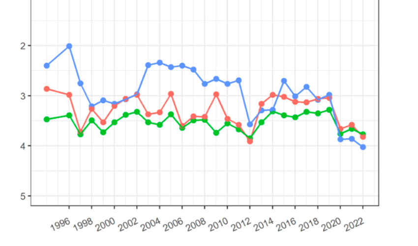 Podíváme-li se konkrétně na hodnocení činnosti vlády, parlamentu a prezidenta za rok 2022 v kontextu hodnocení předchozích let (Graf 2), jsou patrné dvě skutečnosti. Zaprvé, občané výkon klíčových politických institucí dlouhodobě hodnotí spíše jen jako průměrný (známka 3) nebo dokonce ještě horší (s výjimkou hodnocení práce prezidenta v některých letech). Zadruhé, poslední rok patřil v tomto hodnocení k těm historicky vůbec nejhorším od začátku 90. let. Nízké hodnocení všech tří klíčových politických institucí přitom trvá již od začátku pandemie COVID-19. Jako by pandemie odstartovala období skepse v politickou reprezentaci, která trvá nehledě na to, jestli je u vlády hnutí ANO a ČSSD (roky 2020 a 2021) nebo současná vládní koalice (rok 2022). Výmluvný je především pokles hodnocení prezidenta, který měl historicky tendenci těšit se zpravidla nejlepšímu hodnocení. V roce 2022 ale bylo jeho hodnocení historicky nejhorší, zřejmě v důsledku neaktivity a války na Ukrajině.