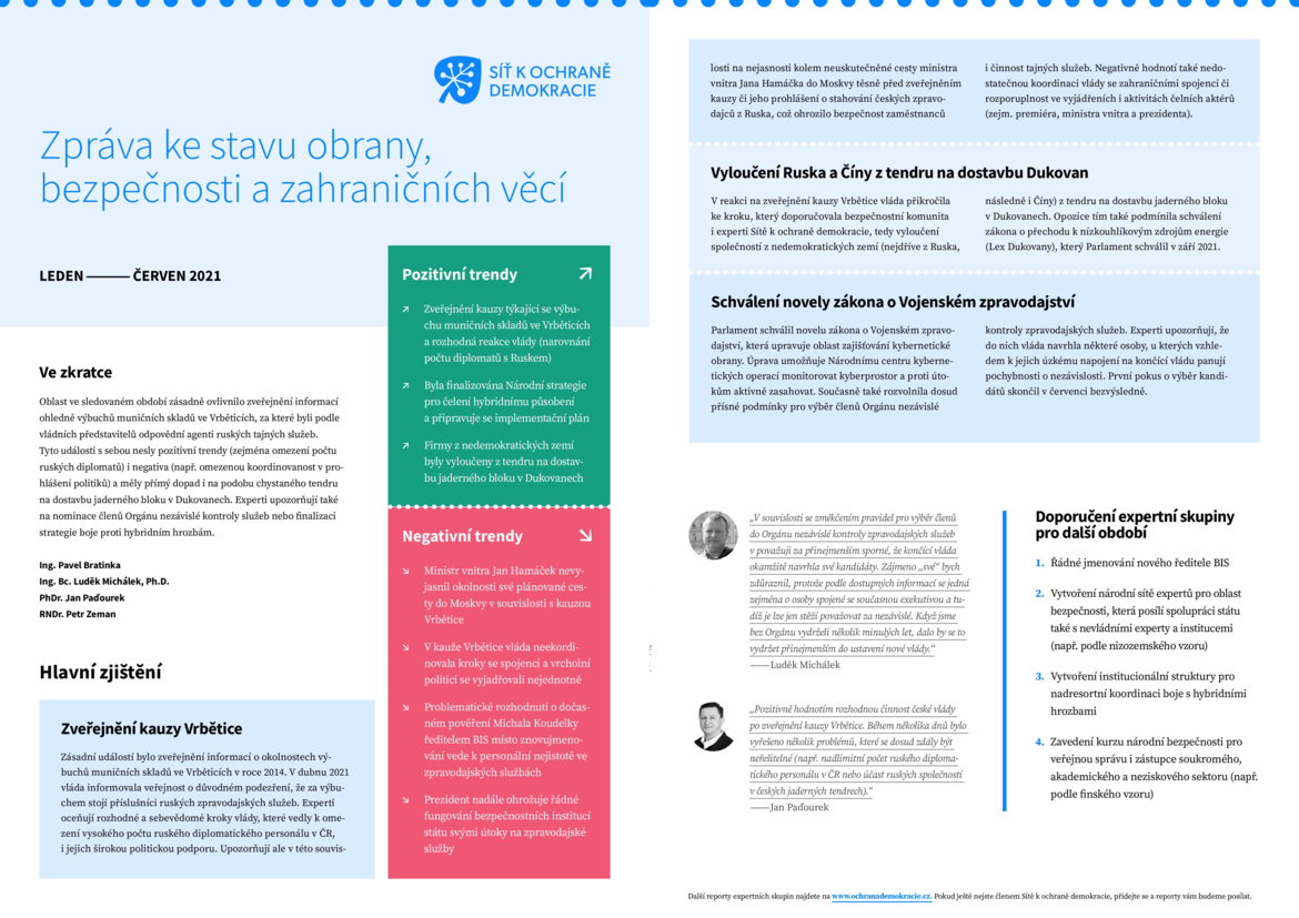 Oblast bezpečnosti ve sledovaném období zásadně ovlivnilo zveřejnění informací ohledně výbuchů muničních skladů ve Vrběticích, za které byli podle vládních představitelů odpovědní agenti ruských tajných služeb. Tyto události s sebou nesly pozitivní trendy (zejména omezení počtu ruských diplomatů) i negativa (např. omezenou koordinovanost v prohlášení politiků) a měly přímý dopad i na podobu chystaného tendru na dostavbu jaderného bloku v Dukovanech. Experti upozorňují také na nominace členů Orgánu nezávislé kontroly služeb nebo finalizaci strategie boje proti hybridním hrozbám.