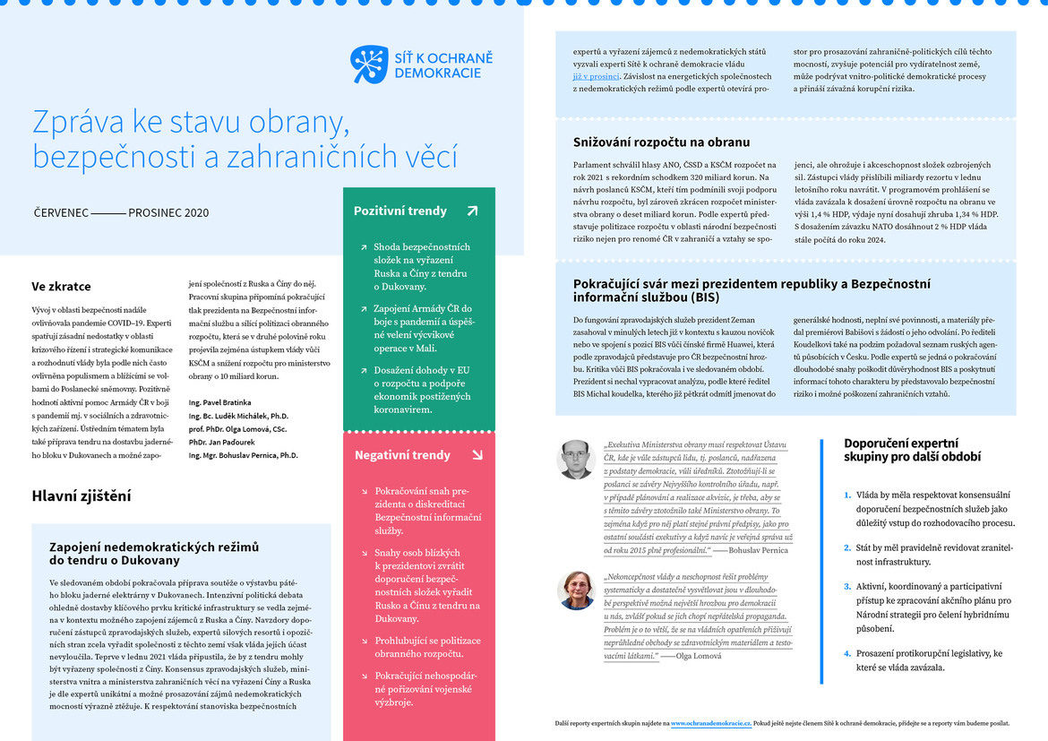 Vývoj v oblasti bezpečnosti v uplynulém pololetí ovlivňovala pandemie COVID–19. Experti spatřují zásadní nedostatky v oblasti krizového řízení i strategické komunikace a rozhodnutí vlády byla podle nich často ovlivněna populismem a blížícími se volbami do Poslanecké sněmovny. Pozitivně hodnotí aktivní pomoc Armády ČR v boji s pandemií mj. v sociálních a zdravotnických zařízení. Ústředním tématem byla také příprava tendru na dostavbu jaderného bloku v Dukovanech a možné zapojení společností z Ruska a Číny do něj, které experti dlouhodobě kritizují. K vyřazení Rosatomu z tendru nakonec došlo tento týden v souvislosti s kauzou Vrbětice. Přečtěte si hlavní závěry hodnocení stavu obrany, bezpečnosti a zahraničních věcí, jak je vidí experti Sítě k ochraně demokracie.