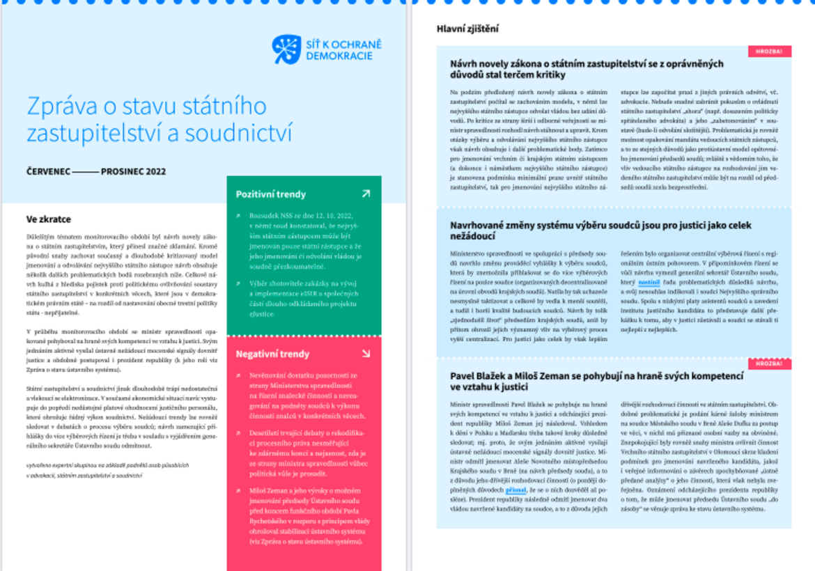 V průběhu monitorovacího období se ministr spravedlnosti opakovaně pohyboval na hraně svých kompetencí ve vztahu k justici. Svým jednáním aktivně vysílal ústavně nežádoucí mocenské signály dovnitř justice a obdobně postupoval i prezident republiky (k jeho roli viz Zpráva o stavu ústavního systému).