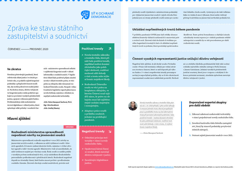 Navzdory přetrvávající pandemii, která ovlivňovala oblast justice i ve druhé polovině roku, se podařilo zajistit bezpečné podmínky a přizpůsobit činnost soudů tak, aby mohla pokračovat soudní jednání. Na druhou stranu, důvěru veřejnosti ve fungování justice může podrývat opakující se provinění vysokých představitelů justice, spojené s výkonem jejich funkce. Problematická je stále nedostatečná úroveň digitalizace v oblasti justice, která způsobuje velké průtahy v soudních řízeních - ministerstvo spravedlnosti selhává v zajišťování fungování soudů v oblasti informatiky a soudních znalců. Přečtěte si hlavní závěry hodnocení stavu justice, jak je vidí experti Sítě k ochraně demokracie.