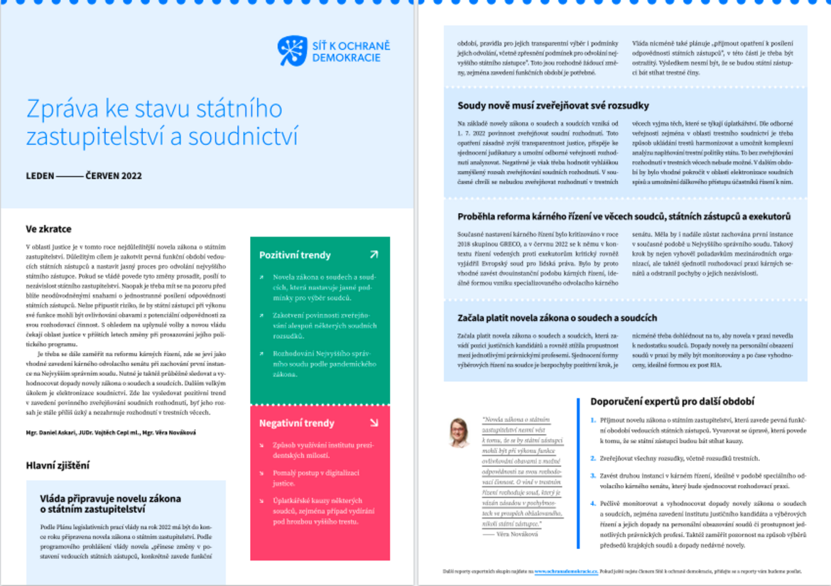 V oblasti justice je v tomto roce nejdůležitější novela zákona o státním zastupitelství. Důležitým cílem je zakotvit pevná funkční období vedoucích státních zástupců a nastavit jasný proces pro odvolání nejvyššího státního zástupce. Pokud se vládě povede tyto změny prosadit, posílí to nezávislost státního zastupitelství.