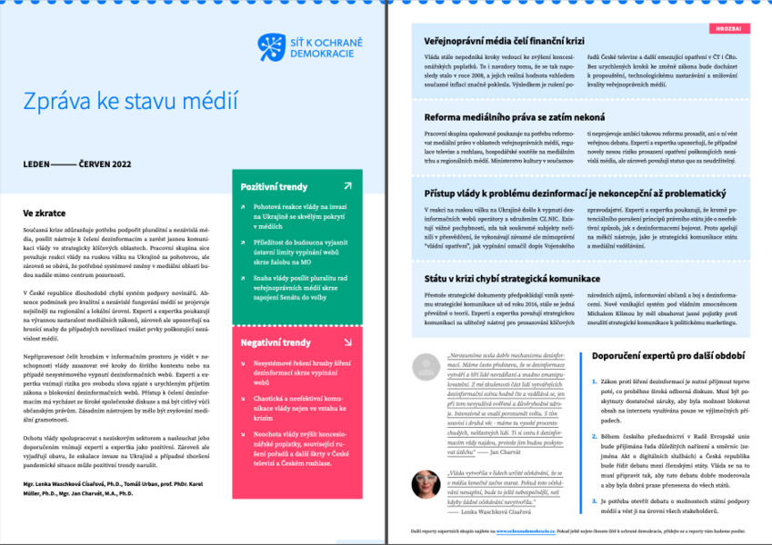 Současná krize zdůrazňuje potřebu podpořit pluralitní a nezávislá média, posílit nástroje k čelení dezinformacím a zavést jasnou komunikaci vlády ve strategicky klíčových oblastech. Pracovní skupina zhodnotila 1. polovinu roku 2022 poměrně kladně a považuje reakci vlády na ruskou válku na Ukrajině za pohotovou, ale zároveň se obává, že potřebné systémové změny v mediální oblasti budou nadále mimo centrum pozornosti.