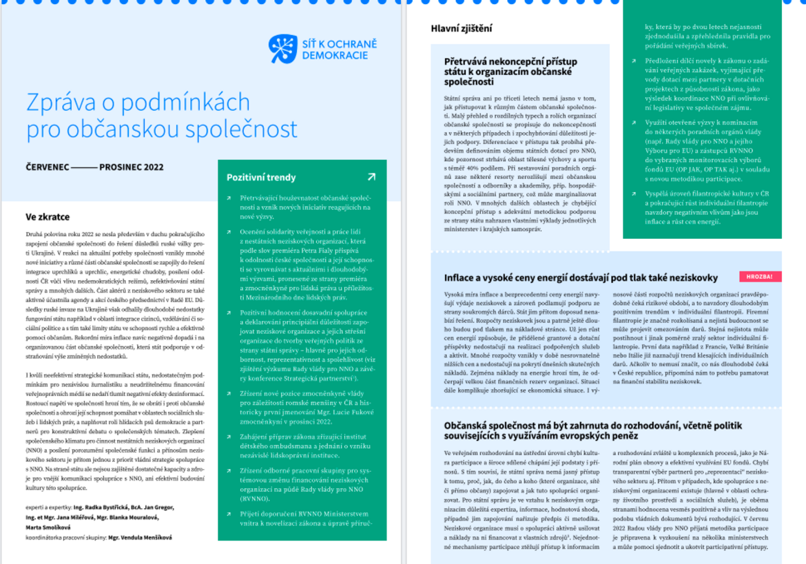 Druhá polovina roku 2022 se nesla především v duchu pokračujícího zapojení občanské společnosti do řešení důsledků ruské války proti Ukrajině. V reakci na aktuální potřeby společnosti vznikly mnohé nové iniciativy a různé části občanské společnosti se zapojily do řešení integrace uprchlíků a uprchlic, energetické chudoby, posílení odolnosti ČR vůči vlivu nedemokratických režimů, zefektivňování státní správy a mnohých dalších.