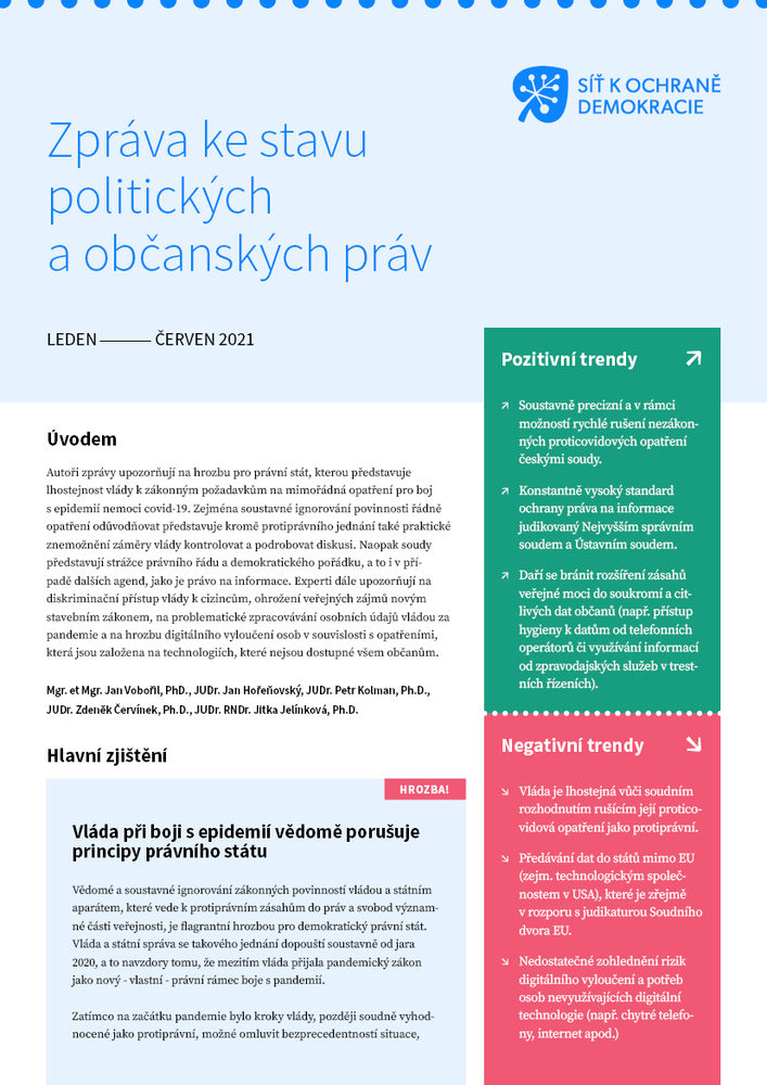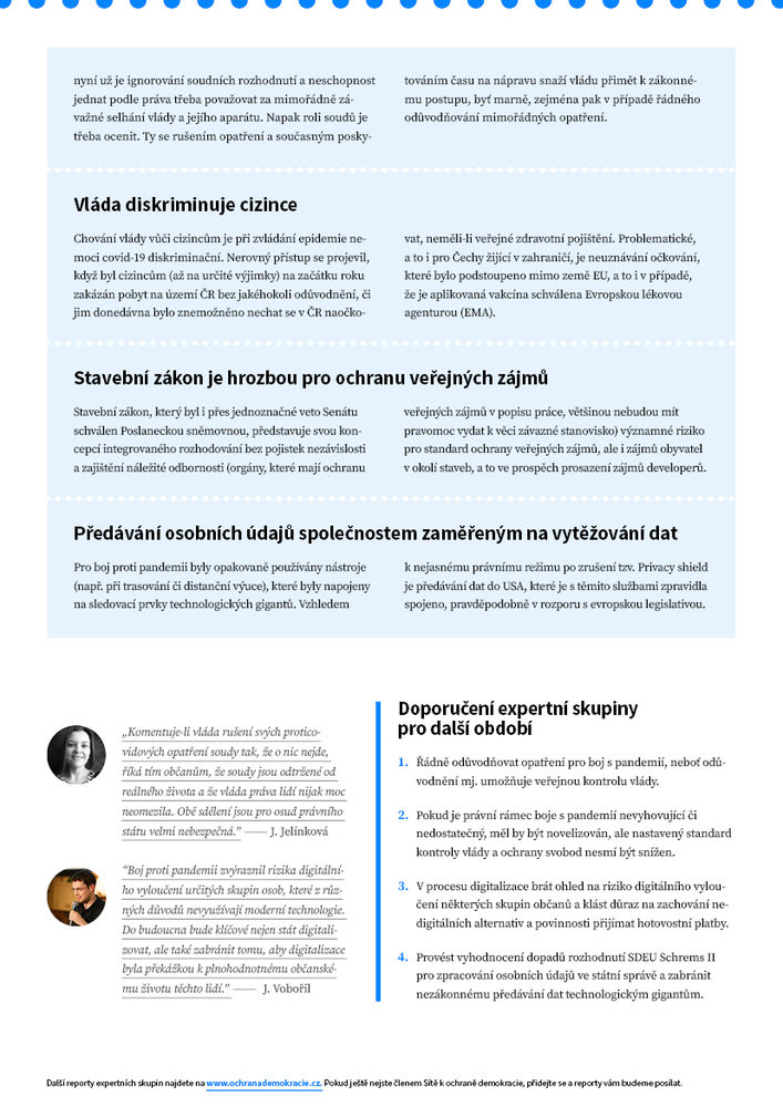 Autoři zprávy upozorňují na hrozbu pro právní stát, kterou představuje lhostejnost vlády k zákonným požadavkům na mimořádná opatření pro boj s epidemií nemoci covid-19. Zejména soustavné ignorování povinnosti řádně opatření odůvodňovat představuje kromě protiprávního jednání také praktické znemožnění záměry vlády kontrolovat a podrobovat diskusi. Naopak soudy představují strážce právního řádu a demokratického pořádku, a to i v případě dalších agend, jako je právo na informace. Experti dále upozorňují na diskriminační přístup vlády k cizincům, ohrožení veřejných zájmů novým stavebním zákonem, na problematické zpracovávání osobních údajů vládou za pandemie a na hrozbu digitálního vyloučení osob v souvislosti s opatřeními, která jsou založena na technologiích, které nejsou dostupné všem občanům.