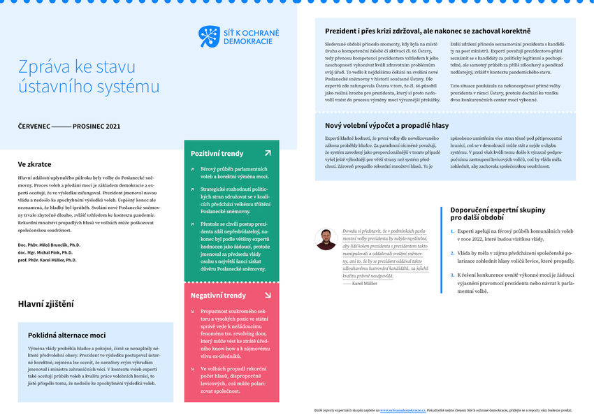 Hlavní událostí uplynulého půlroku byly volby do Poslanecké sněmovny. Proces voleb a předání moci je základem demokracie a experti oceňují, že ve výsledku zafungoval. Prezident jmenoval novou vládu a nedošlo ke zpochybnění výsledků voleb. Úspěšný konec ale neznamená, že hladký byl i průběh. Svolání nové Poslanecké sněmovny trvalo zbytečně dlouho, zvlášť vzhledem ke kontextu pandemie. Rekordní množství propadlých hlasů ve volbách může poškozovat společenskou soudržnost.