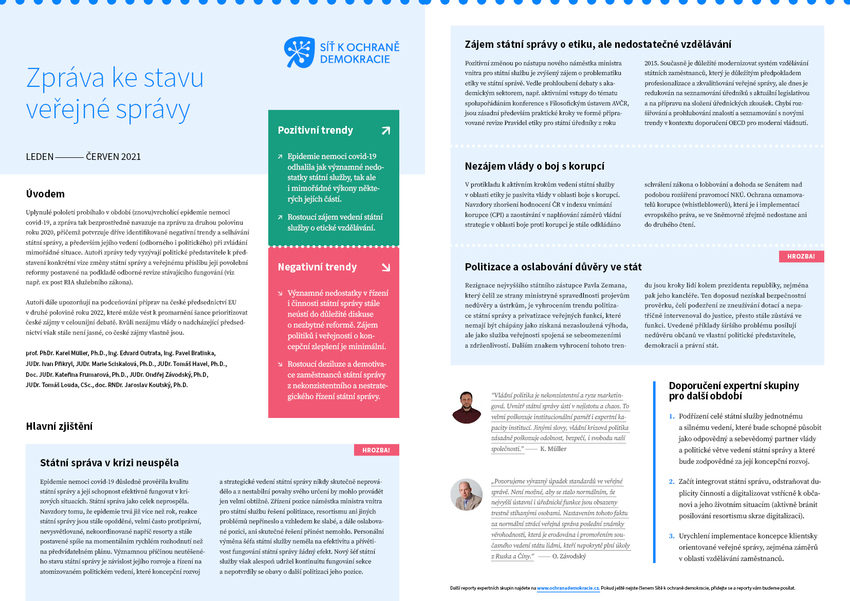 Uplynulé pololetí probíhalo v období (znovu)vrcholící epidemie nemoci covid-19, a zpráva tak bezprostředně navazuje na zprávu za druhou polovinu roku 2020, přičemž potvrzuje dříve identifikované negativní trendy a selhávání státní správy, a především jejího vedení (odborného i politického) při zvládání mimořádné situace. Autoři zprávy tedy vyzývají politické představitele k představení konkrétní vize změny státní správy a veřejnému příslibu její povolební reformy postavené na podkladě odborné revize stávajícího fungování (viz např. ex post RIA služebního zákona).