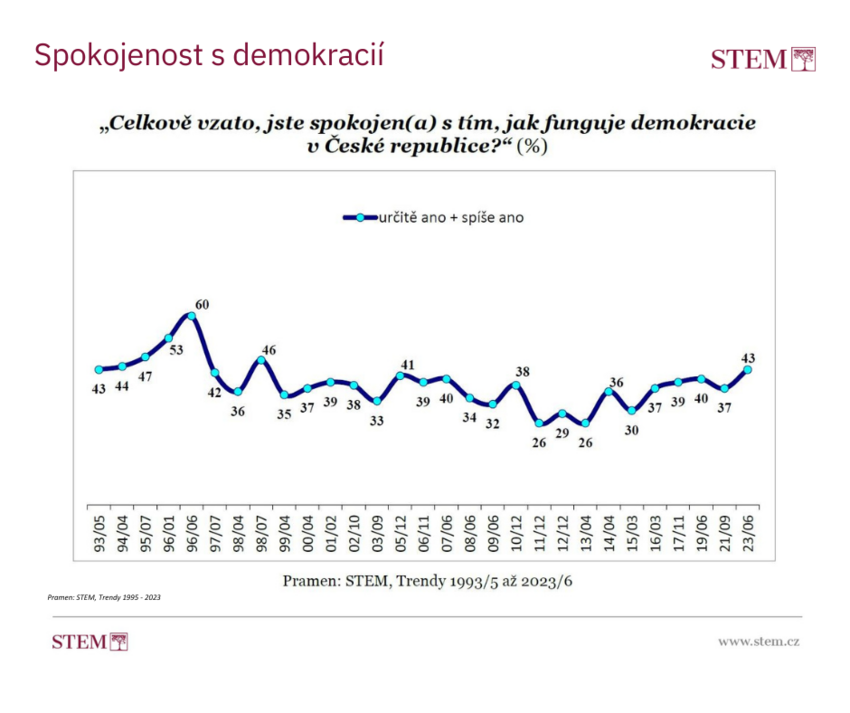 Závěry podstatné pro hodnocení české demokracie na expertním setkání představil ředitel analytického ústavu STEM Martin Buchtík. Důvěra ve vládu ČR se podle STEM pohybuje na 21 %, což je propad o více než 10 procentních bodů od doby, kdy vláda začínala. Níže byla důvěra naposledy v roce 2013, tedy před 10 lety, kdy padla Vláda Petra Nečase. Prezidentovi důvěřuje 57 % obyvatel, naposledy byla tak vysoko v roce 2020. „V Česku je aktuálně blbá nálada. Ekonomická nálada se zvolna uklidňuje, nejohroženějších nepřibývá. Vnímání aktuální situace je ale výrazně odlišné v různých sociálních skupinách. Už to zkrátka trvá dlouho,“ řekl ředitel STEM Martin Buchtík k prezentovaným číslům.