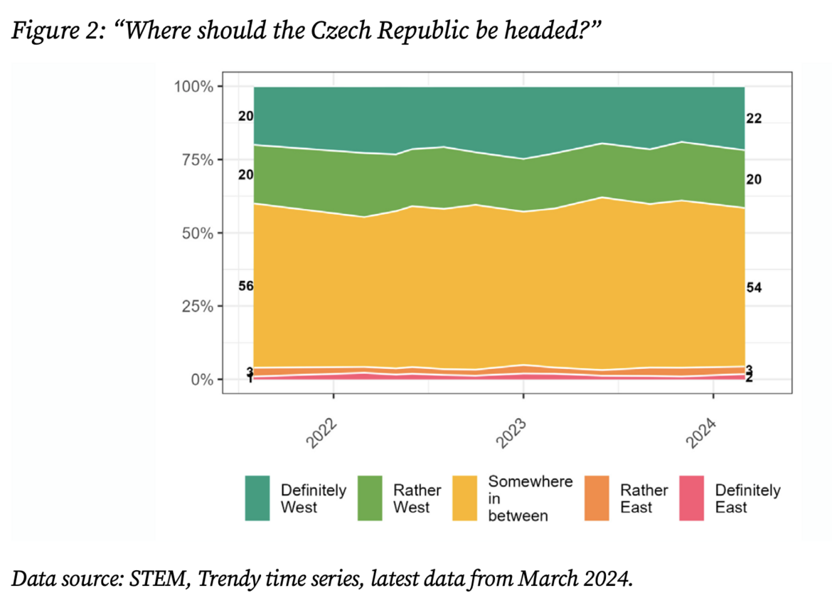 The Czech public currently reports one of the highest historical rates of financial stability. Yet, public sentiment remains pessimistic about the country’s direction. The war in Ukraine continues to shape how people perceive their future. Over 55% of Czechs prefer a geopolitical position “between East and West.”